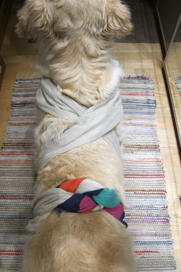 Voit kokeilla myös omatekoista ”Turvapaitaa” koiran turvallisuudentunteen lisäämiseksi.